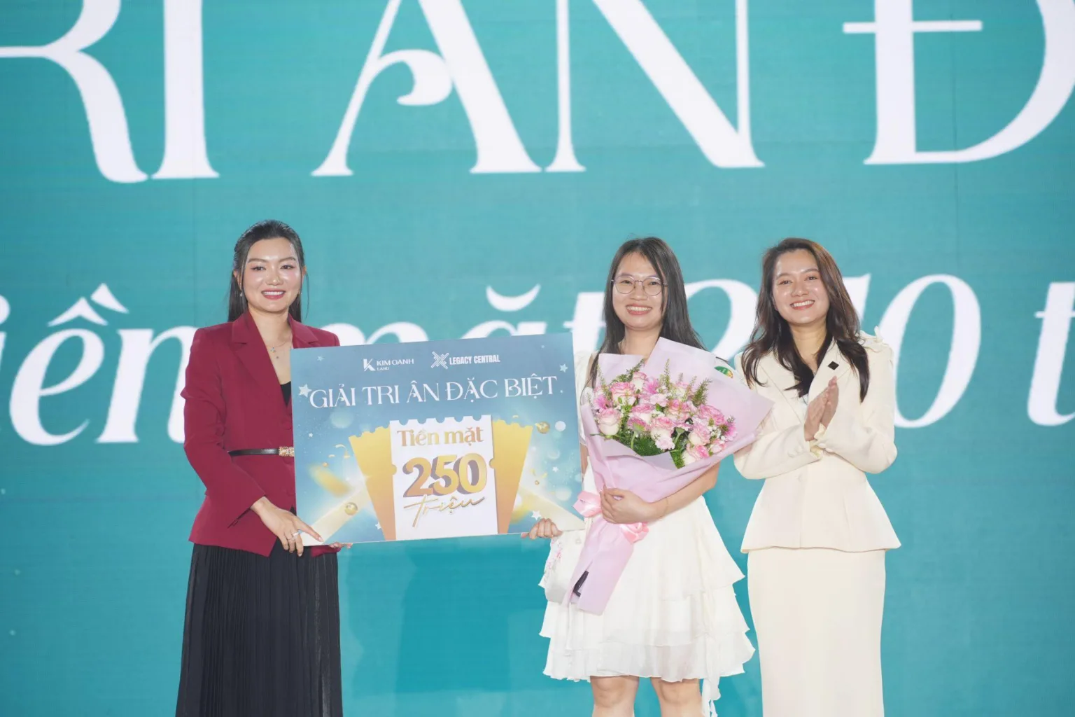 Bà Đặng Thị Kim Oanh và ông Nguyễn Thuận trao giải đặc biệt là 250 triệu đồng tiền mặt đến khách hàng Mai Hoàng Quân. Anh Quân chia sẻ: “Tôi thật sự bất ngờ và xúc động khi trở thành người may mắn nhận giải thưởng lớn này. Nhưng với gia đình tôi, điều quan trọng hơn là đã chọn đúng nơi an cư tại Legacy Central. Ngay từ đầu, tôi đã tin vào uy tín của Kim Oanh Land, và qua quá trình triển khai cũng như chất lượng căn hộ thực tế, niềm tin đó càng được củng cố. Giải thưởng hôm nay càng khẳng định niềm tin trọn vẹn hơn cho quyết định của tôi”.