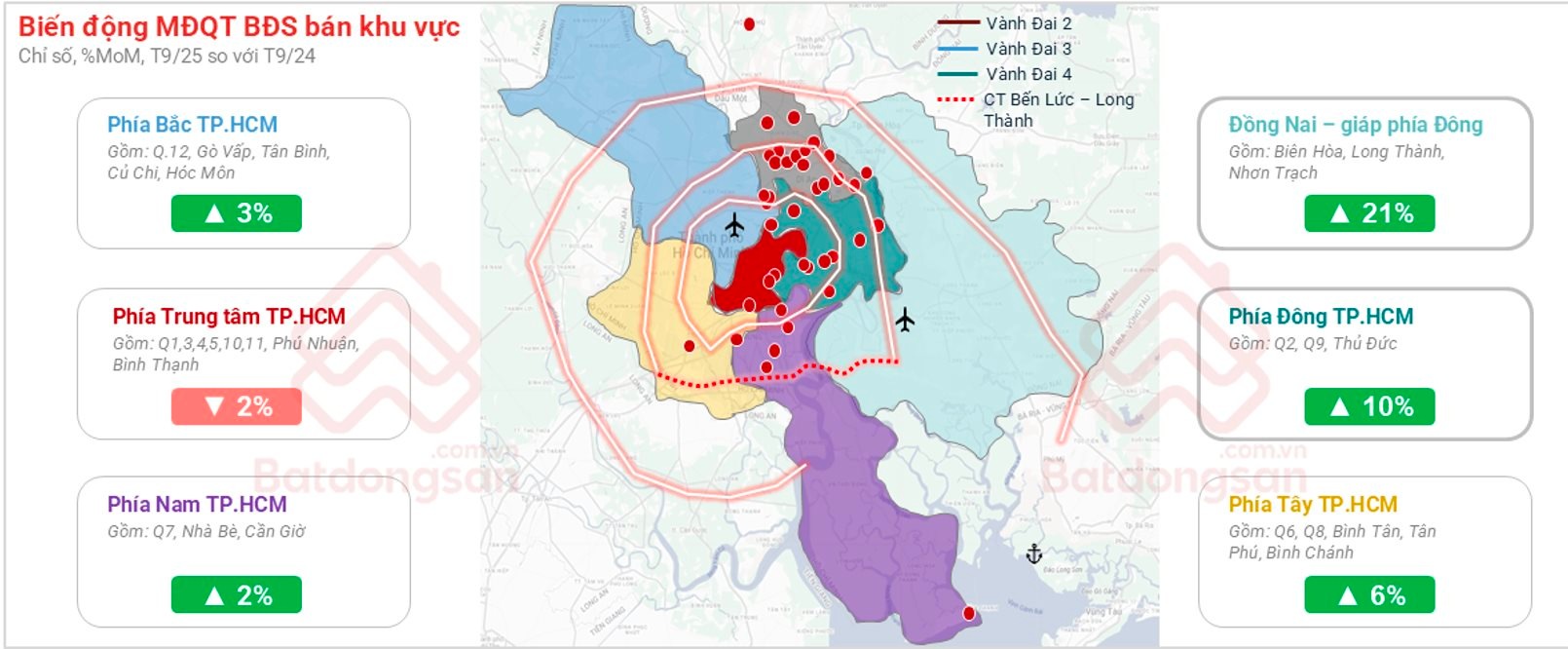 Ở phân khúc đất nền, thị trường phía Đông TP.HCM cũng đang hồi phục. Mức độ quan tâm tại khu vực này trong tháng 9/2025 tăng 6% so với tháng 4/2025, cao hơn phía Tây (+3%) và phía Bắc (+5%), trái ngược xu hướng giảm ở phía Nam.