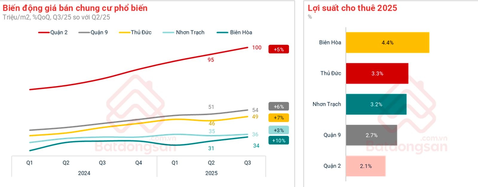Điểm sáng thị trường bất động sản giáp ranh phía Đông TP.HCM còn nằm ở lợi suất cho thuê chung cư. Trong khi Quận 2 đạt mức 2,1%, Quận 9 khoảng 2,7% và Thủ Đức đạt 3,3%, thì Biên Hòa vươn lên dẫn đầu với 4,4%, tiếp đến là Nhơn Trạch 3,2%.