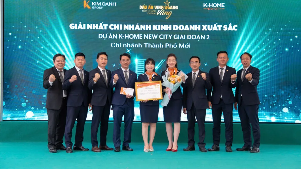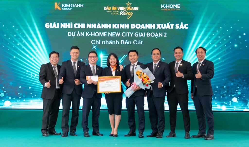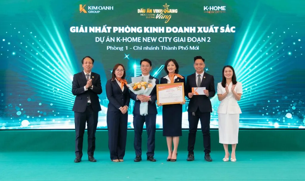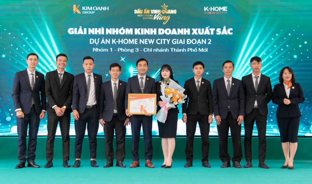 Là dự án trọng điểm của năm 2025, K-Home New City đã đóng góp quan trọng vào kết quả kinh doanh nổi bật của Kim Oanh Group trong nửa đầu năm. Chỉ sau ba tháng ra mắt, các chiến binh kinh doanh Kim Oanh Group đã chinh phục thị trường ngoạn mục với 1.035 sản phẩm được giao dịch thành công, tạo nên “cơn sốt” mới trên thị trường bất động sản khu Đông Bắc TP.HCM. Trong ảnh: bà Nguyễn Thị Nhung và ông Tô Duy Chinh đã trao Giải Nhất – Chuyên viên kinh doanh xuất sắc dự án K-Home New City giai đoạn 2 cho ông Thái Hoàn Nhã, đến từ Nhóm 2 – Phòng 3 – Chi nhánh Thành Phố Mới.
