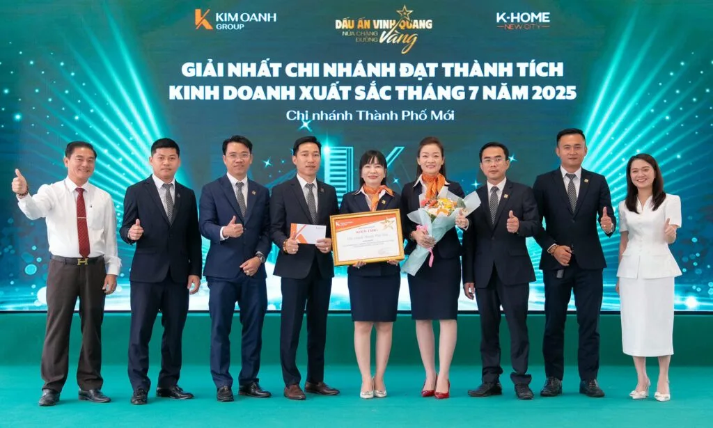 Tiếp nối hành trình ấn tượng của nửa đầu năm, Khối Kinh doanh Kim Oanh Group tiếp tục giữ vững phong độ và tinh thần bứt phá trong quý 3-2025, liên tiếp chinh phục những cột mốc mới với nhiều kết quả đáng tự hào. Trong ảnh: Chi nhánh Thành Phố Mới được vinh danh với Giải Nhất – Chi nhánh kinh doanh xuất sắc tháng 7-2025.