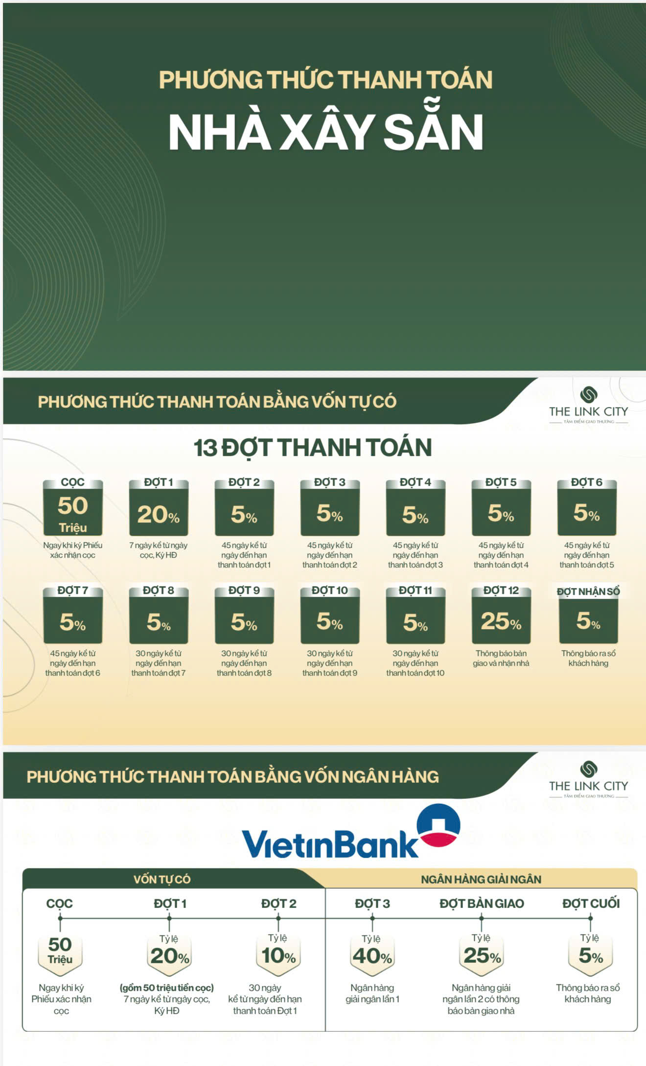Nếu khách hàng mua đất nền / nhà phố xây sẵn tại dự án The Link City, được Kim Oanh Group hỗ trợ thanh toán bằng vốn tự có, theo nhiều đợt thanh toán (lãi suất 0%) hoặc vay ngân hàng Vietinbank & MB Bank với lãi suất ưu đãi trong 20-30 năm.
